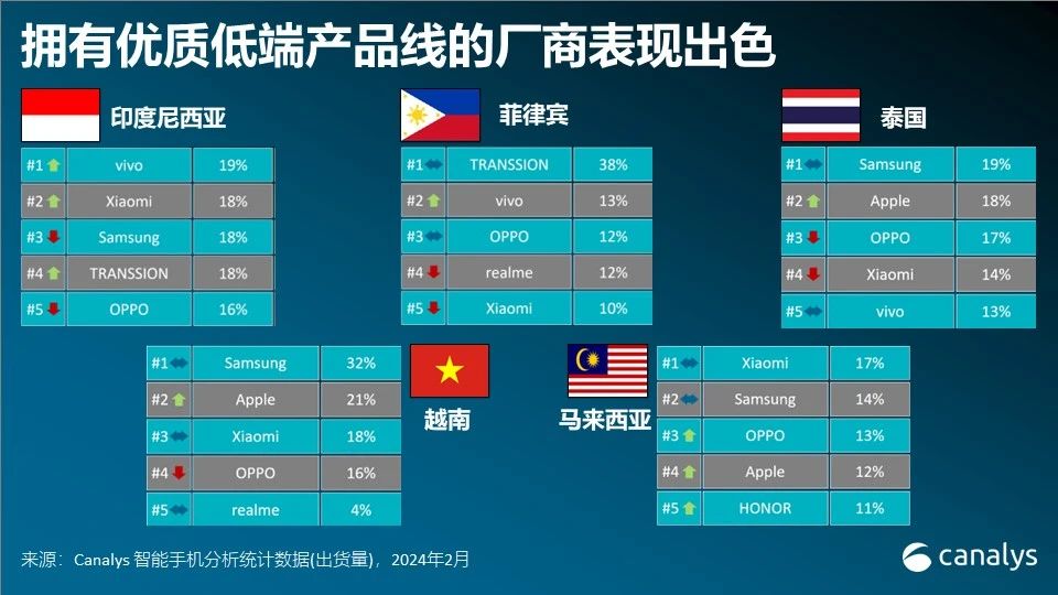 Canalys分析师周乐轩(Le Xuan Chiew)表明:“低于299美元的设备持续拉动东南亚商场大部分的出货,占2023年第四季度总出货量的82%。传音在12月份智能手机出货量中初次登顶。但是,价格竞赛的加重和商场饱满关于厂商在定价和定位该细分商场的产品时构成应战。三星和OPPO等专心于高端商场的厂商或许难以直接与Infinix、Tecno、小米和realme等品牌推出的价格亲民的机型竞赛。相反,它们的方针是经过品牌商铺和电信协作等高端途径来招引更具付费才能的顾客,在价格之外完成差异化。例如,在马来西亚,荣耀经过Rahmah方案和运营商途径等行动,扩展其5G产品线,完成184%同比激增。在阅历2023年年头的窘境之后,途径同伴依然坚持慎重,厂商依然面临着平衡设备的价格和库存办理的应战。”