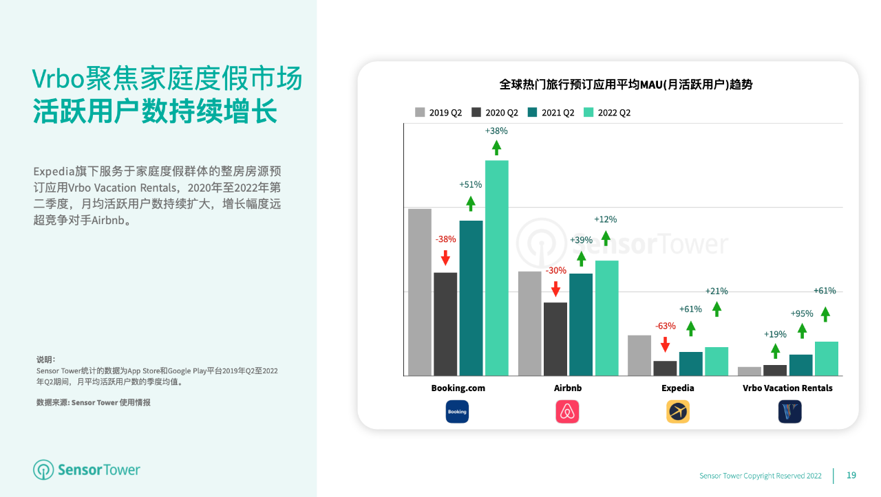 2020年第二季度,Booking.com、Airbnb和Expedia等全球抢手游览预定运用均受疫情影响,月平均活泼用户明显下滑。而以家庭休假人群为首要消费集体的住宿预定运用Vrbo Vacation Rentals,2020年至2022年第二季度月平均活泼用户持续增加,且增幅逾越竞争对手Airbnb。