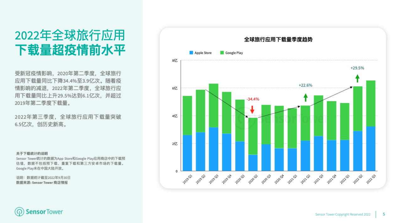 2020年第二季度,全球游览运用下载量因疫情影响同比下降34.4%至3.9亿次。跟着全球游览商场的逐渐康复,2022年第二季度游览运用下载量同比上升29.5%达6.1亿次。2022年第三季度游览运用下载量持续增加至6.5亿次,创前史新高。