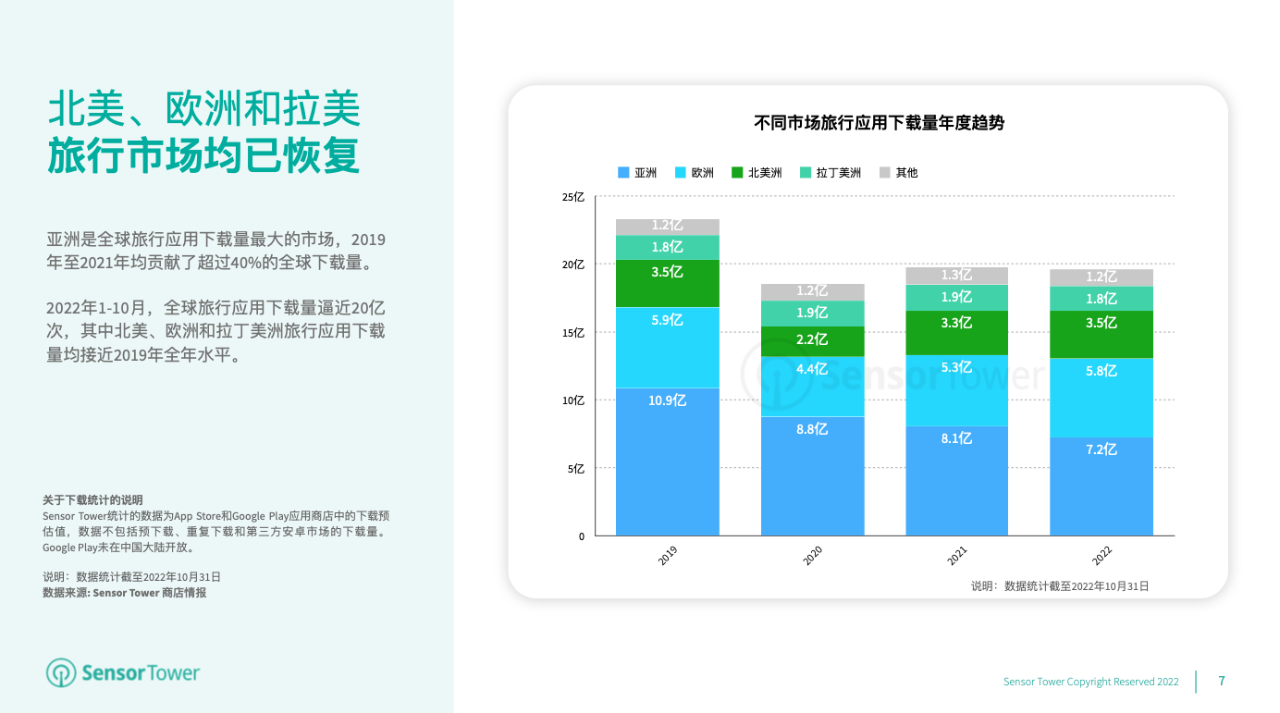 依据 Sensor Tower 最新发布的陈述,受疫情影响,2020年全球游览运用下载量下滑20.6%。跟着疫情影响的减退,2022年1-10月全球游览运用下载量迫临20亿次,其间北美、欧洲和拉丁美洲等首要商场下载量已逾越疫情前水平。