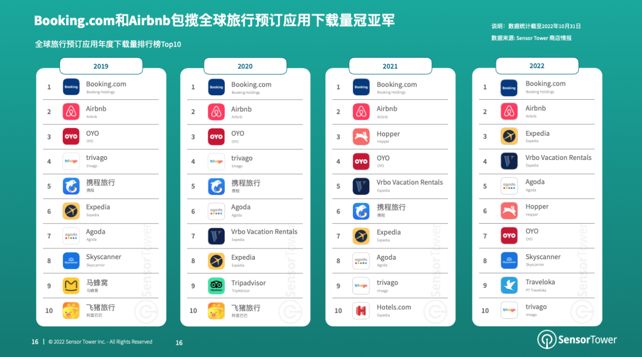 在游览预定细分范畴,荷兰在线住宿预定运用Booking.com(中文名:缤客)接连多年位居全球下载量排行榜第一,排名第二的是全球民宿短租预定运用Airbnb。Expedia旗下住宿预定运用Vrbo Vacation Rentals下载量从2020年的第7名上升至2022年的第4名。